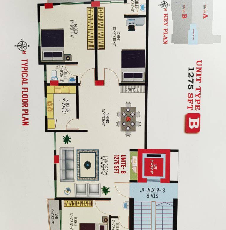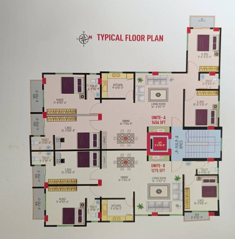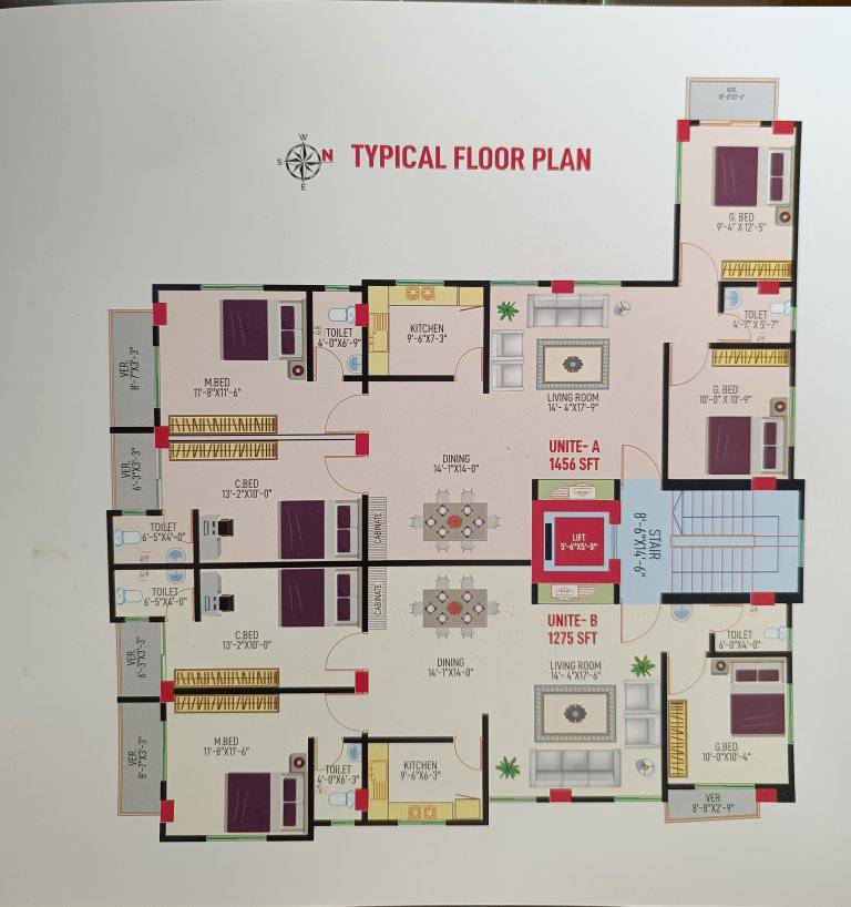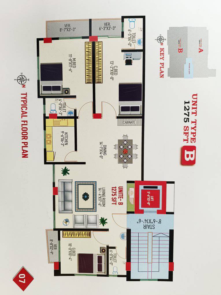ফ্ল্যাট সাইজ-( ১২৭৫+১২০ পার্কিং) স্কয়ারফিট ।